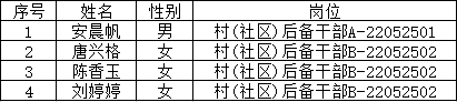 根據《長豐縣下塘鎮2022年公開選拔村(社區)后備干部公告》(2022-05-18)相關要求,經過網上報名、資格初審、筆試、資格復審、面試、體檢、政審等程序,現將擬聘人員名單公示如下。